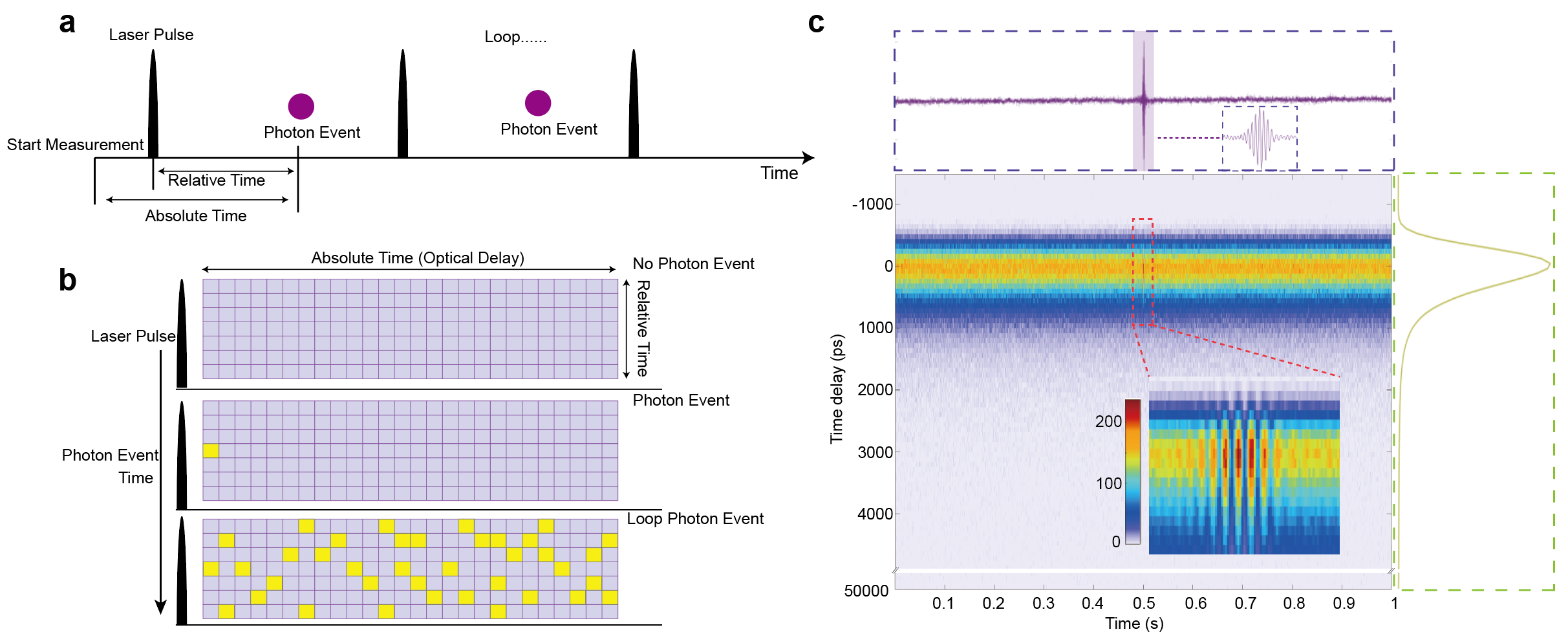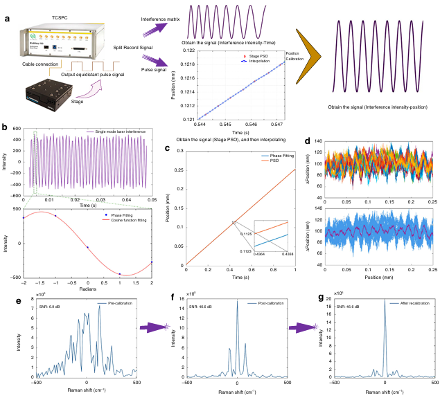 研究團隊采用馬赫曾德爾干涉儀結合高精度直線電機位移臺,并與單光子雪崩二極管、單光子計數器時間標記采集配合使用(圖1),允許將光子事件按照發生絕對時間和相對時間順序放置在光子矩陣中(圖2a,b)。該矩陣橫軸疊加為干涉強度曲線,縱軸疊加為熒光壽命曲線(圖2c)。