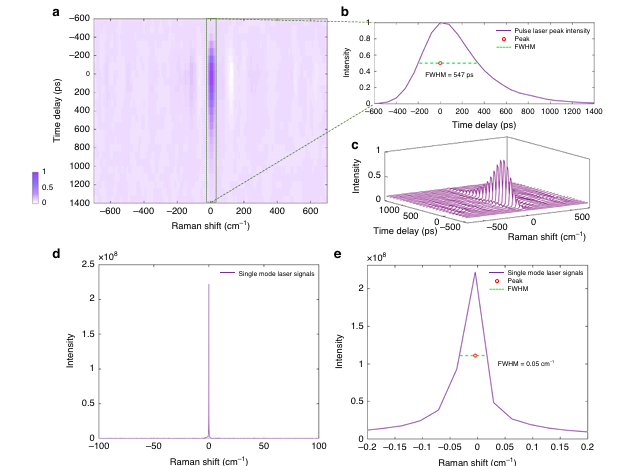 為了確定系統整體時間分辨率和光譜分辨率,研究團隊首先使用脈沖激光測試其時間分辨率。從脈沖激光譜線2D、3D熱圖(圖4a,c)中可以看出該儀器實現了547 ps的時間分辨率(圖4b)。其次使用連續激光測試系統最大光譜分辨率,從圖中可以看到系統最大可實現的光譜分辨率為0.05 cm-1(圖4d,e)。
