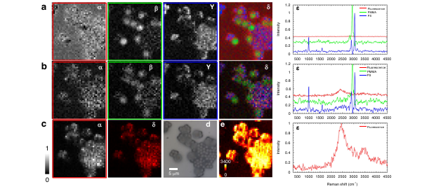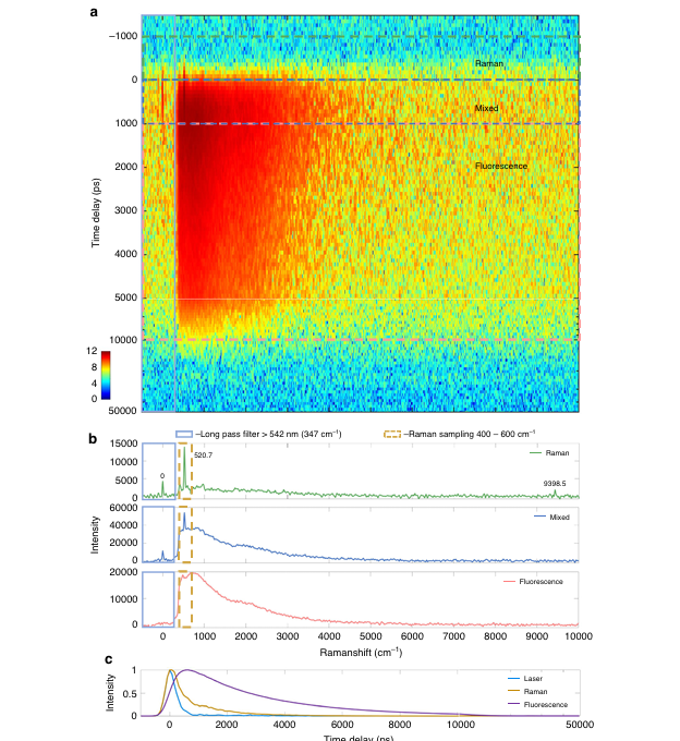 為了驗證系統的拉曼熒光信號分離能力。團隊使用在表面涂覆熒光材料的硅片進行實驗(R6G-PVA-Si)。圖5a為樣品掃描結果熱圖(時間延遲 -1000-50000ps.光譜范圍為-500-10000cm-1)。將熱圖按照時間延遲進行區域劃分可以設置為拉曼區域,拉曼熒光混合區域,熒光區域。圖5b為不同區域的光譜均譜。可以看到在拉曼區域有明顯的硅峰信號,而隨著時間延遲增大,熒光信號開始顯現,直到無法看到硅峰信號。結果證明了系統的拉曼熒光分離能力。