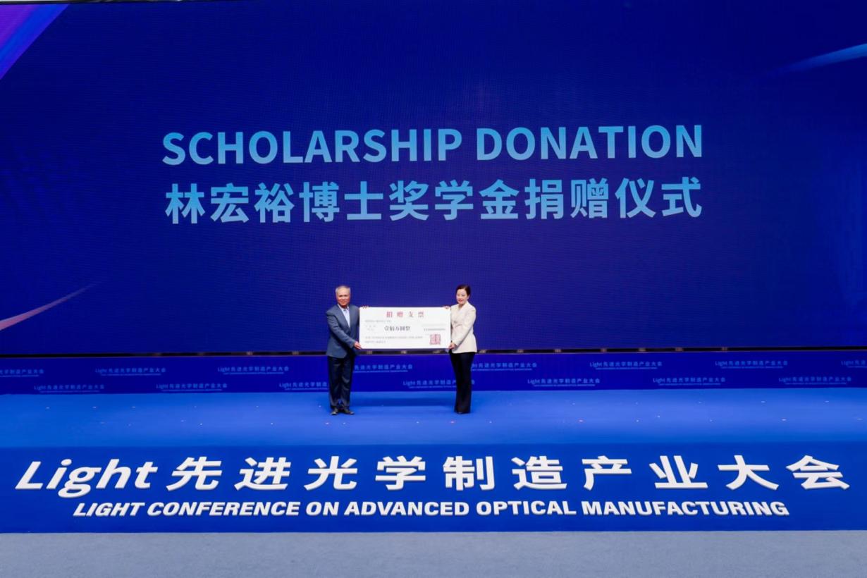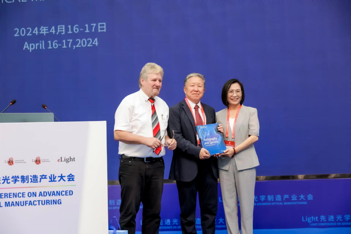 本次大會涵蓋了光學制造、光學檢測、產業技術等多個領域,主題突出,內容豐富,形式多樣,包括重要領導致辭、院士學術報告、產業主旨報告、簽約儀式、圓桌會議、主題報告等,同時設有三個平行專題研討會,全面交流和探討光學制造產業的最新動態和前沿技術。大會于4月16日下午正式開幕,由上海光機所研究員、Light:Advanced Manufacturing(簡稱LAM)編委蘇榕主持,英國皇家工程院院士、哈德斯菲爾德大學教授蔣向前,德國斯圖加特大學教授、LAM主編Wolfgang Osten,如皋市市委書記何益軍,中國工程院院士、長春光機所所長張學軍,上海交通大學副校長朱新遠,霖鼎光學董事長任明俊分別致開幕辭。Wolfgang Osten教授以全息專刊寶典獻禮原科技部副部長、季華實驗室理事長/主任、Light榮譽主編、LAM主編曹健林和長春光機所副總師、Light品牌創始人、Light執行主編白雨虹,場面溫馨而動容。張學軍、斯圖加特大學Rainer Gadow 教授、美國穆爾納米技術公司Matt Davies博士圍繞超精密非球面和自由光學拋光等先后做了大會學術報告。如皋市市長王鳴昊向參會代表介紹了如皋市取得的重要產業成果,并希望廣大參會者來此洽談合作、共謀發展。會議期間舉辦了霖鼎光學如皋產業基地建成慶典,至此,歷時3年、總投資20億元的如皋首個“雙飛地”孵化項目正式落地。此外,林宏裕博士向如皋市高級技工學校霖鼎光學產業學院捐贈獎學金100萬元。