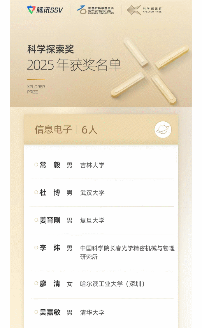 “科學探索獎”是由新基石科學基金會設立、科學家主導的公益獎項,旨在支持中國內地及港澳地區45周歲以下(女性48周歲以下)的青年科技工作者。該獎項每年評選不超過50人,每人獲300萬元獎金分5年發放,覆蓋數學物理學、生命科學等10個領域。2025年第七屆獲獎者中,女性占比18%創歷史新高,35歲以下年輕科學家達26%,研究方向包括火星生命探測、人工視網膜修復等前沿課題。該獎項由楊振寧等14位科學家與騰訊馬化騰聯合發起,至今已資助347位科學家。