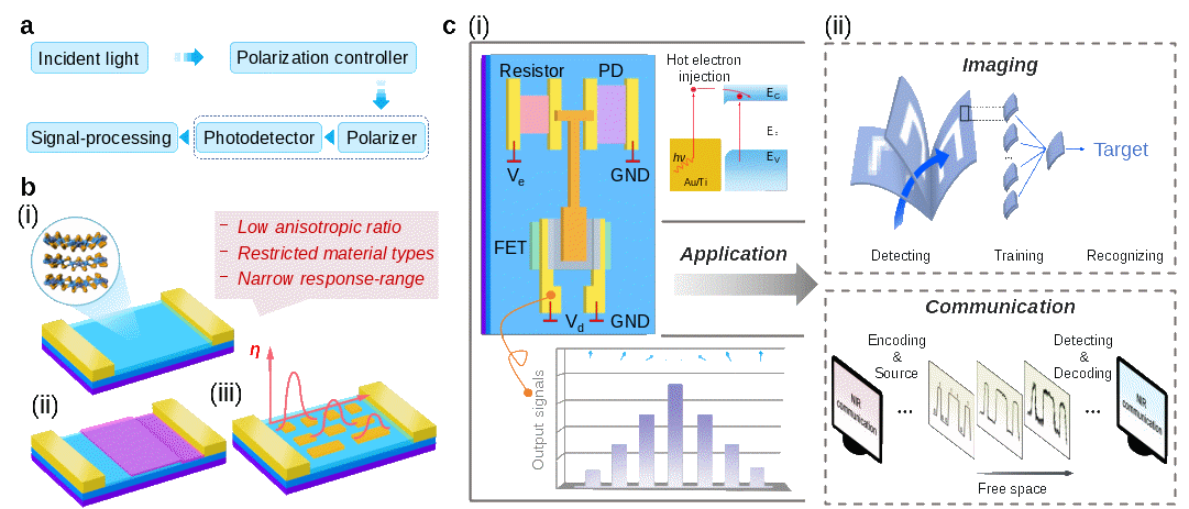 圖1:a.傳統的偏振探測技術;b.現有的二維材料基偏振光探測器的概述及其局限性;c.偏振探測系統的示意圖及應用展示。