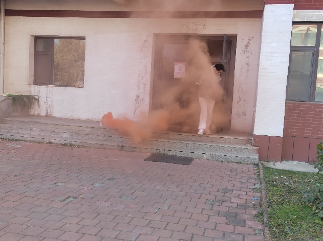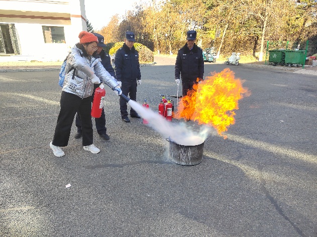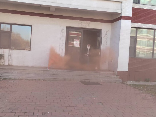 12時55分,研究生部各公寓樓聲光警報響起,同時拉開公寓樓下消防演習專用煙霧彈,演練正式開始。研究生們聽到警報聲后按照指定路線快速有序地撤離到安全區域。到達指定安全區域后,警隊人員為研究生講解干粉滅火器和二氧化碳滅火器的使用方法及注意事項,消防栓的使用流程及水帶的連接方法,并指導同學們進行滅火器滅火實操演練。